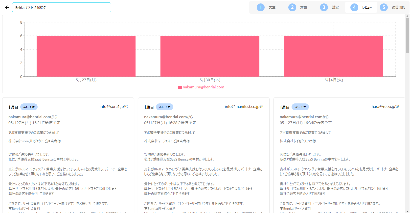 ④レビューでは、設定したメールを一つずつチェックすることが可能です。