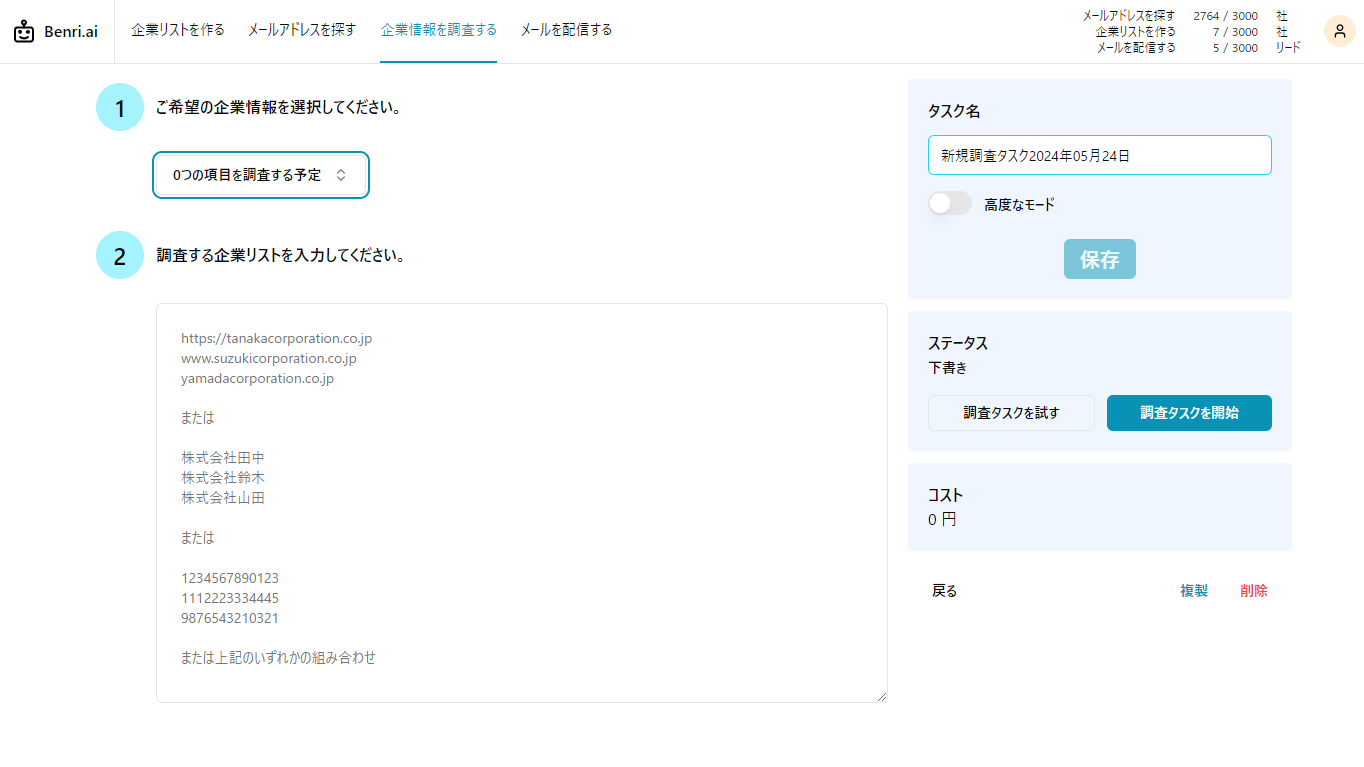 調査タスクを試すのボタンをクリックすると、複数入力した企業のうち1社分の調査結果を表示することができます。