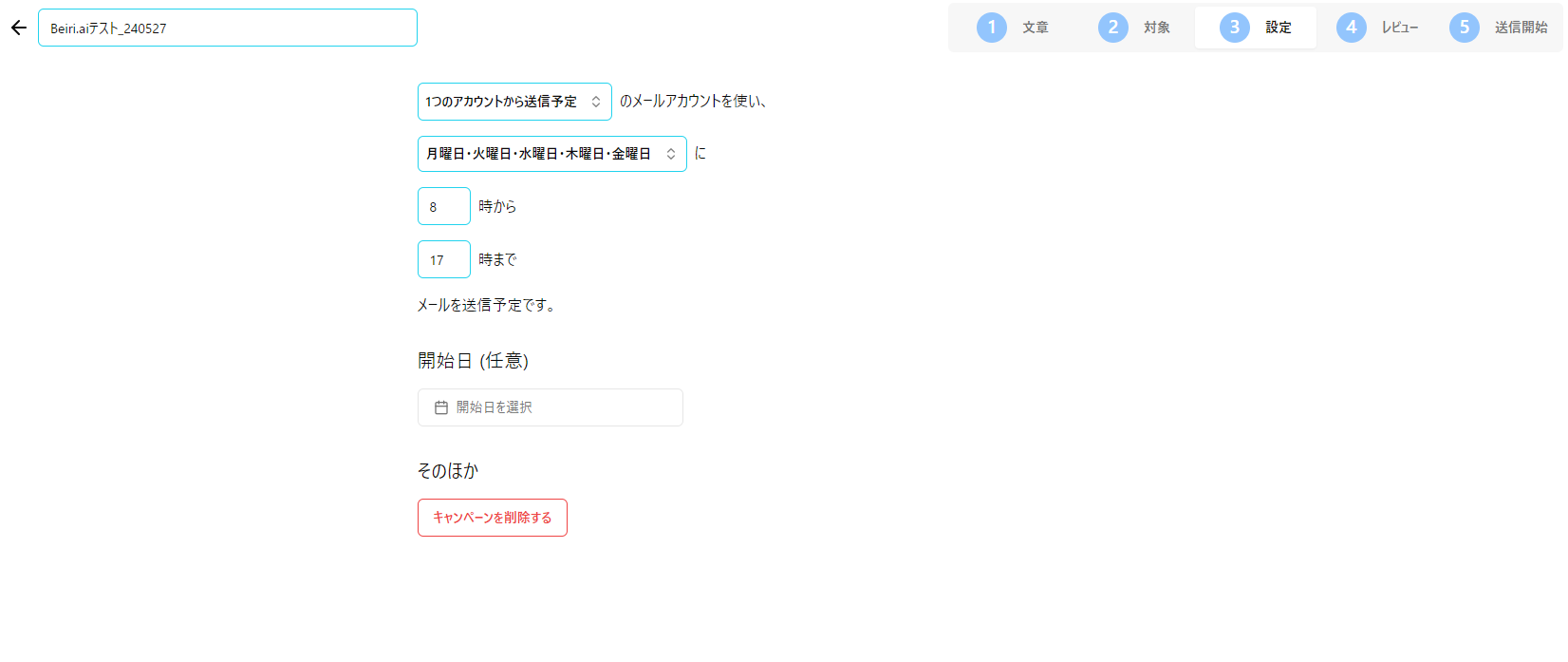 右上の「新規キャンペーン」をクリックすると①文章のページになります。ここでは、初回のメールからステップメールまで文章を設定頂きます。